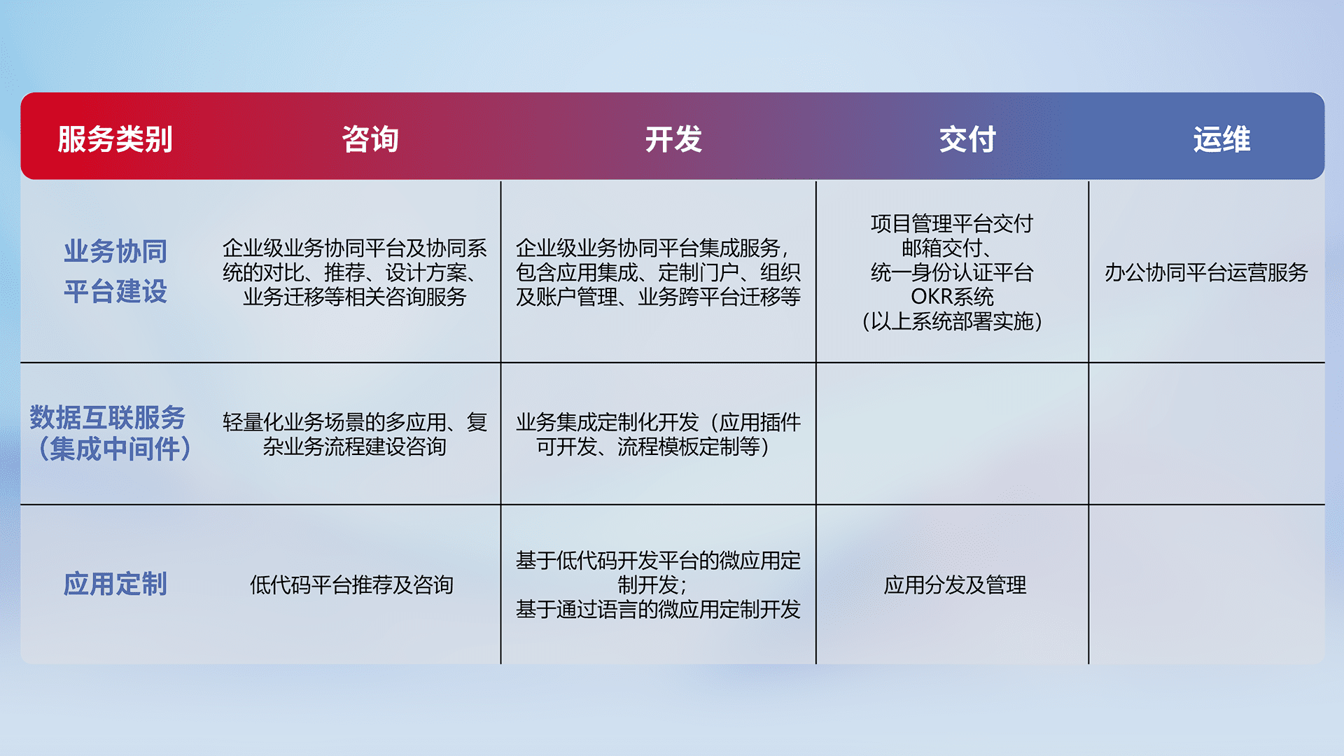 针对钉钉、、企微、、、、IDaas等平台级产品提供产品的规划、、、、方案、、、交付、、、、定制化开发等服务,,实现如统一协同办公、、、智能客户服务、、、、混合会议管理、、智能数据查询、、等业务场景,,,实现数字化转型。。。。
