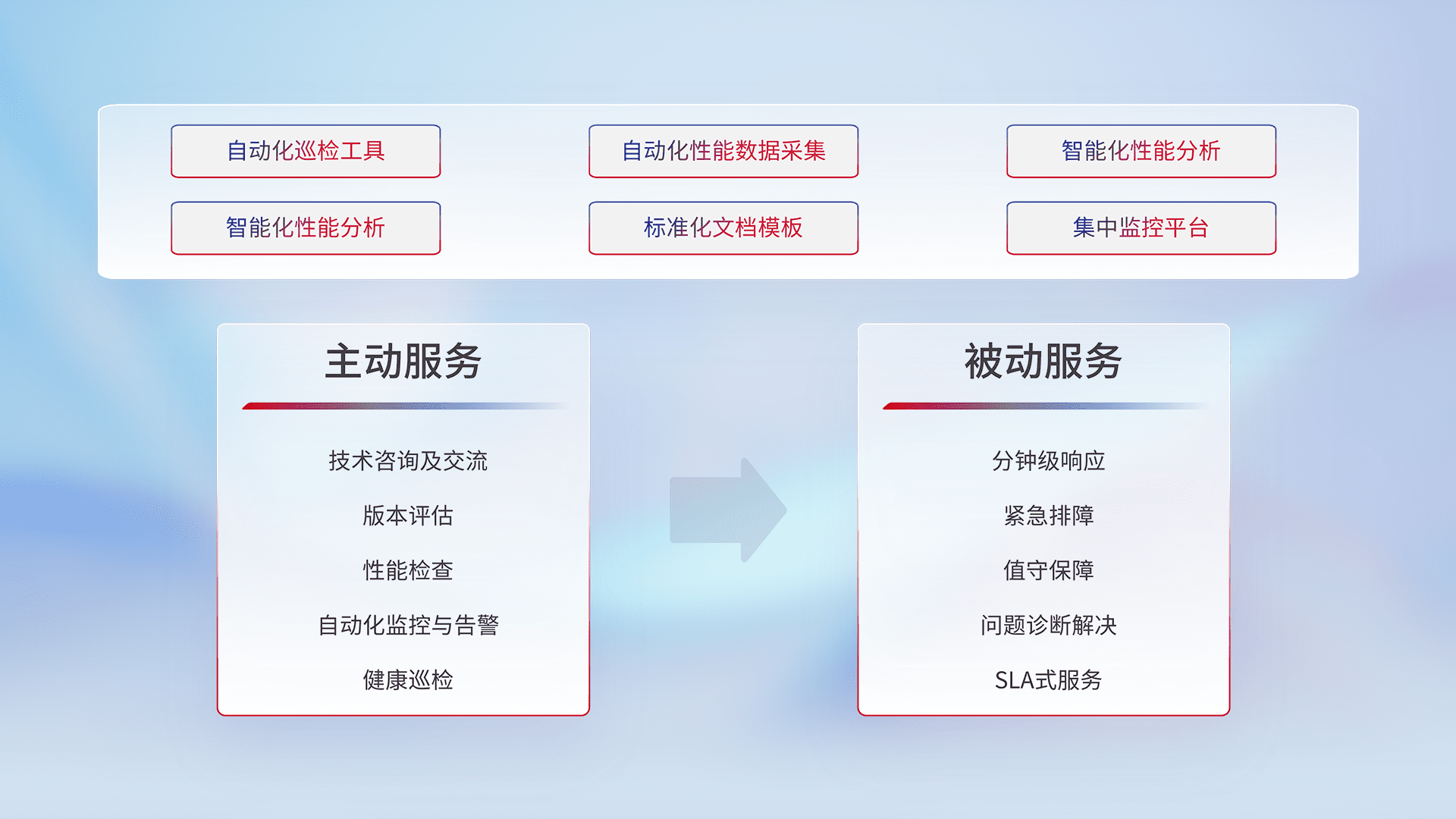 智能化工具和标准化文档,,,,保障服务质量,,,提供主动服务(包含技术咨询、、、版本评估、、性能检查、、、自动化监控与告警、、、、健康巡检)和被动服务包含(分钟级响应、、、紧急排障、、值守保障、、问题诊断解决、、、SLA服务)。。