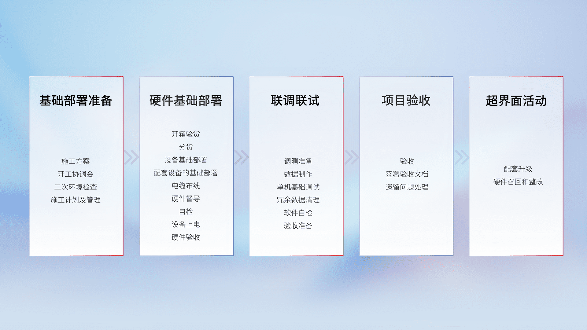 从基础部署准备、、硬件基础部署、、联调联试、、、项目验收、、、、越界面活动的全过程可追溯,,,保证施工质量和进度。。